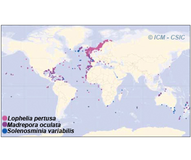 En aquest mapa de la segona imatge es poden observar les zones on s’han localitzat bancs de corals freds de les espècies Lophelia pertusa, Madrepora oculata i Solenosmitia variabilis, que són les que realment formen els esculls de profunditat.