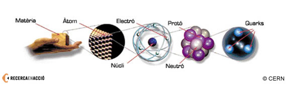 Però els àtoms no són els components més petits de la matèria sinó que estan compostos per electrons que giren al voltant d’un nucli central tal com els planetes giren al voltant del Sol (estructura de l’àtom). El nucli també té una estructura interna: està compost de protons i neutrons. Tot això es coneixia ja en els anys 10 del segle passat juntament amb el descobriment de la radioactivitat. Aquesta última no és res més que el trencament de l’àtom o del nucli amb l’emissió d’alguns d’aquests components fonamentals: electrons, neutrons, protons, energia en forma de llum o combinacions d’ells. L’existència de la radiació va ser un element fonamental que va ajudar als científics a indagar en el món subatòmic. Investigacions posteriors varen demostrar que els protons i els neutrons tenen també una estructura interna, és a dir, no són partícules fonamentals sinó que estan formats per tres “quarks”.