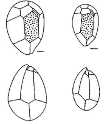 Dibuixos a escala de la vista superior (epiteca) i inferior (hipoteca) d’Ostreopsis siamensis i Ostreopsis ovata segons Steidingen i Tangen (1996). La barra d’escala son 10 micres. A banda de la diferència de mides, a nivell morfològic no veiem més diferències. Però hem de tenir en compte que el rang de mides d’aquestes dues espècies és molt variable, i s’encavalca en la majoria dels casos. Per tant, en la majoria dels casos és impossible de diferenciar-les morfològicament.