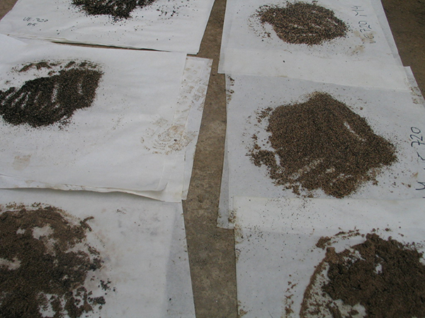 Un cop recollit el sediment comença el procés de criba. Els sediments són introduïts per separat en grans bidons amb aigua i al cap d’unes hores estona ja podem veure com algunes restes de carbons i llavors comencen a flotar… Això són bones notícies ja que vol dir que en les mostres de terra recollides hi han restes analitzables i que aportaran noves dades vers l’entorn de la ciutat romana.