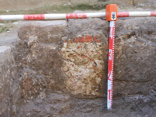 Hem descobert bona part d’un mur que pertany a una de les estances d’una possible domus. D’aquesta habitació no en sabem la utilitat encara, pel fet que ens trobem immersos en el procés d’excavació dels estrats que l’amortitzen. Un cop han començat a aparèixer les primeres pedres de la construcció d’aquest mur, hem pogut apreciar que a la cara interna del mateix, apareixia una fina capa d’estuc, (una capa uniforme de calç) el qual hem pogut posar al descobert en una petita part, per tal de poder entreveure la seva tipologia i estat de conservació. De vegades aquests estucs només fan la funció de capa protectora o impermeabilitzant, i d’altres serveixen de llenç per a decorar les parets de les habitacions.