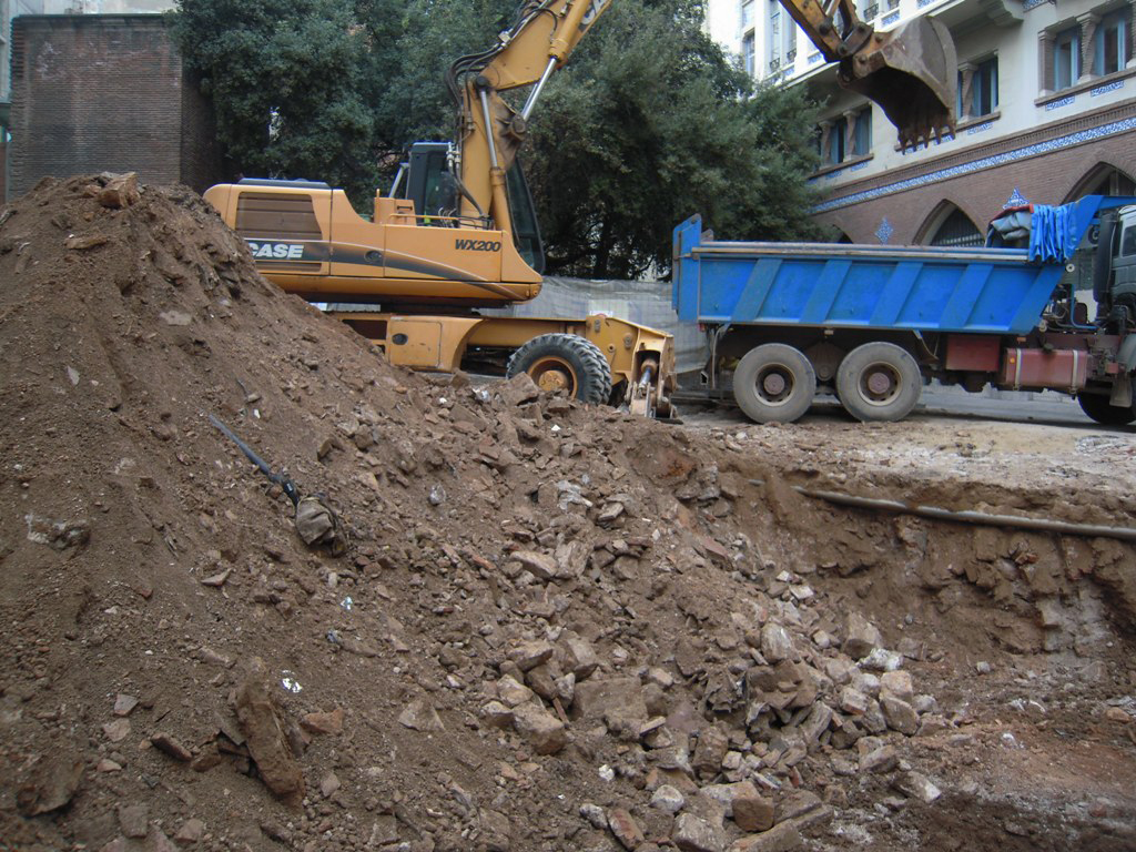 El primer transport el fem amb un recollidor, després amb un cabàs, continuem amb un sac o un contenidor i acabem omplint camions i més camions de gran tonatge! Com que els arqueòlegs de Sotstinent han treballat tant, ja hi ha un munt de terra que s’ha de treure del solar. La màquina excavadora estarà uns dies omplint 4 o 5 camions diaris que van a llençar la terra a l’abocador autoritzat del Port de Barcelona, que és el Moll del Prat.