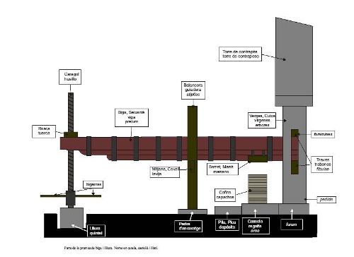 Es tracta d’una biga enorme que descansa sobre un punt de recolzament, talment com una palanca. Per l’extrem esquerra surt uns 15 metres, i pel dret, uns 3 o 4. A l’extrem esquerra, la biga s’aixeca a mesura que hom gira manualment un cargol gegant que hi ha sota de la biga. Es un cargol vertical, de manera que a mesura que es gira la rosca, la biga s’aixeca pel costat esquerra, mentre que pel dret baixa i fa pressió sobre les olives, que se situen en aquest costat dret. Es a dir, es una palanca gegant que permet exercir una forta pressió i extreure’n l’oli.