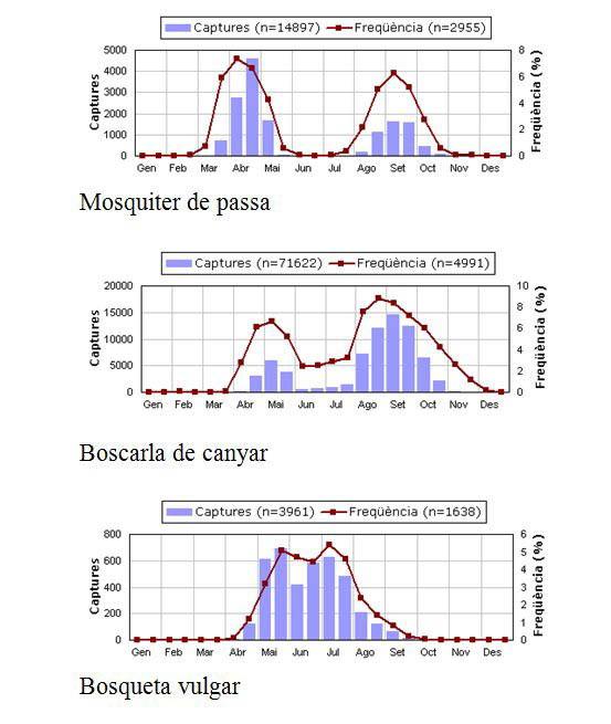 Molts dels passeriformes migradors mostren un mateix patró fenològic: com més aviat arriben o migren a Catalunya durant la primavera, més tard ho fan durant la tardor. Ho podem veure fàcilment fixant-nos en els patrons fenològics de tres espècies que capturem força en el marc d’aquest projecte: el mosquiter de passa, la boscarla de canyar, i la bosqueta vulgar.