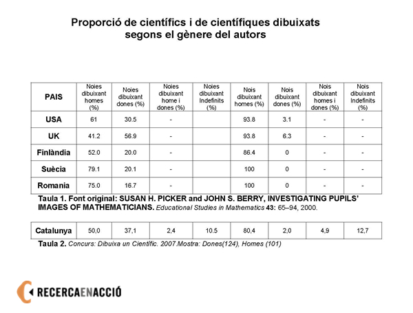 Aquests resultats, contrastats amb estudis internacionals (Steinke et al., 2006; Picker & Berry, 2000; Chambers, 1983) mostren conclusions similars quant a les diferències de gènere i posen de manifest un petit avenç en la igualtat de gènere mostrant una major proporció de dones científiques. En un estudi realitzat sobre les imatges estereotípiques dels científics (Chambers, 1983) es va detectar que únicament les nenes dibuixaven dones científiques, mentre que els nois no en dibuixaven cap. Vint-i-cinc anys després i a Catalunya, un 2% dels nois dibuixen dones científiques, com hem vist.