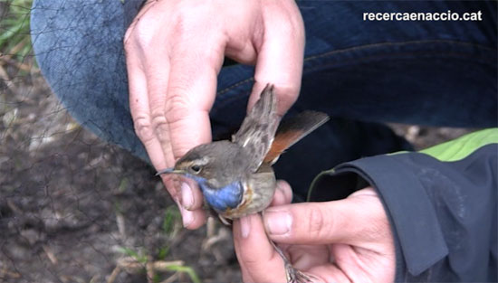 Aquest vídeo mostra tot el procés d’anellament aplicat a un mascle de cotxa blava (Luscinia svecica) capturat als Aiguamolls de l’Empordà el març de 2012.