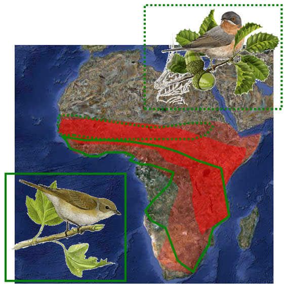 Les àrees d’hivernada africanes varien molt d’una espècie a una altra. El tallarol de garriga i el tallarol gros, per exemple, tot i ser dues espècies que pertanyen al mateix gènere tenen àrees d’hivernada que pràcticament no se superposen. Aquestes diferències en la distribució hivernal són causades per les diferències entre ambdues espècies pel que fa a la selecció de l’hàbitat: el tallarol de garriga prefereix els ambients secs i arbustius mentre que el tallarol gros opta per àrees més humides i amb cobertura arbòria més gran.