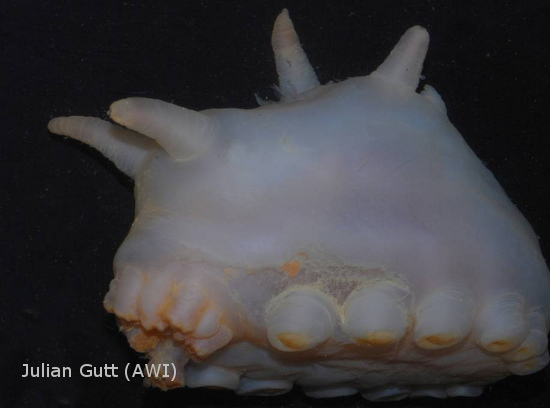 El primer és l’holotúria Elpidias glacialis. És un organisme molt freqüent en fons marins on hi ha molt sediment orgànic.