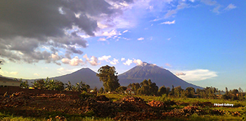 Vista de dos dels volcans Virunga, Mgahinga i Muhabura, des de Musanze.