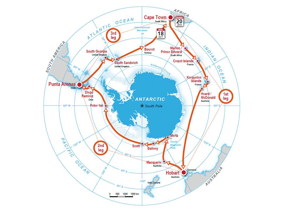 Científics de 30 països de 6 continents, coordinats i patrocinats per l’Institut Polar Suís, participen a l’Antarctic Circumnavigation Expedition (ACE), la primera expedició científica que donarà la volta sencera a l’Antàrtida. Durant tres mesos, entre finals de desembre de 2016 i mitjans de març de 2017, el trencaglaç rus Akademik Treshnikov recorrerà  l’Oceà Austral amb el propòsit de mesurar i quantificar el impacte del canvi climàtic i la contaminació, i les estratègies de la vida, en les aigües fredes i les illes que voregen el continent gelat.