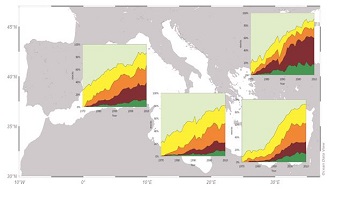 Tendències de les poblacions de peix del Mediterrani i el mar negre des de l’any 1970 al 2010. Verd clar: estocs en desenvolupament; groc: estocs explotats; taronja: estocs sobreexplotats; marró: estocs col·lapsats; verd fosc: estocs en recuperació. Observeu com actualment més de la meitat dels estocs estan sobreexplotats o col·lapsats, i de seguir la mateixa tendència aviat ho estaran la majoria (consulteu l’article original).
