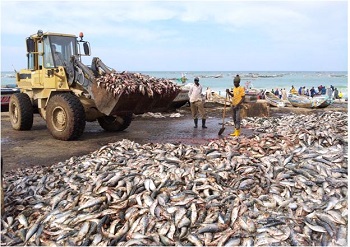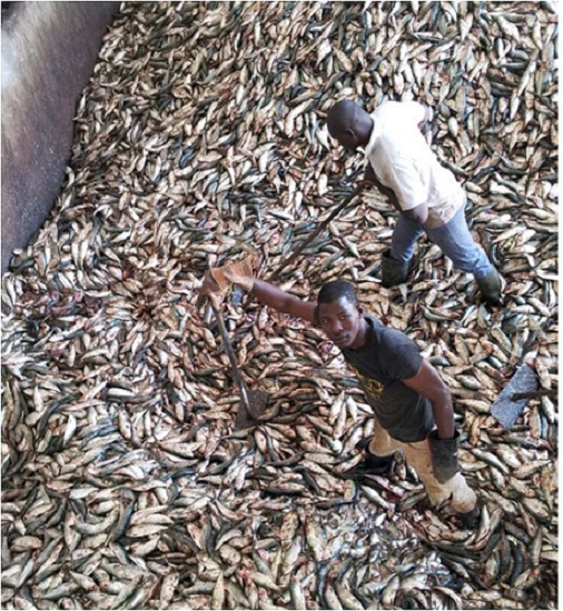 Pràcticament la meitat del peix que s’agafa al corrent de Canàries corresponen a sardines de diverses espècies, una de les preses principals dels ocells marins i altres vertebrats en delicat estat de conservació (etiquetades en vermell com “Herring-likes” en aquests gràfics) . Milers de petites embarcacions com les que es veuen al fons de la fotografia en llencen al mar cada dia a la seva captura. La majoria de peix es porta directament a grans fàbriques on les sardines són immediatament convertides en farina de peix. Bona part d’aquesta farina és la que utilitzem a Europa per alimentar els peixos de les nostres piscifactories.