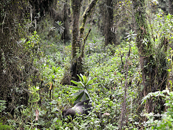 Goril·la enmig de la vegetació densa, que dificulta l’obtenció de fotografies.