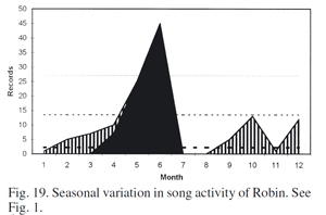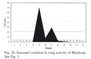 En els dos gràfics, podeu veure l’activitat de cant del tallarol de casquet i del pit-roig al cap de l’any, segons un estudi a Dinamarca. La primavera és el període d’activitat per excel·lència.