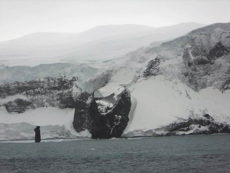 Divendres, arribem a l’illa de més al nord de les Balleny, l’illa Young, en un dia gris. Així i tot, la visió de roques (no n’havíem vist cap, a Mertz) ens atrau molt l’atenció. A mesura que ens apropem, som més conscients de l’alçada dels penya-segats coronats per una enorme glacera. És preciós però agressiu, hostil. Per la poca informació que tenim de les illes, sembla que aquella franja fosca que s’insinua a peu de paret podria ser una platja, interessant per desembarcar-hi i fotografiar i recollir espècimens de qualsevol bestiola i alga que hi pugui viure. Tanmateix, fa feredat: al capdamunt de les parets de roca i glaç treuen el cap els sèracs de la glacera, molt amenaçadors. Dues zodíacs d’exploració s’avancen, i tornen amb més detalls del que ja vèiem: hi ha purgues de gel contínues i la platgeta és plena de blocs caiguts. Massa perillós per desembarcar-hi.