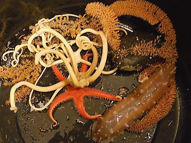 Cau el vespre, i els companys interessats en la biodiversitat dels marges submarins de les illes es posen els pantalons i les botes d’enfangar-se. Després de radiografiar el pendent i forma del fons amb l’eco-sonda, fem unes pesques de ròssec a tres profunditats: 300, 400 i 500 m. Es tracta de rascar una zona limitada del fons per endur-se, amb una xarxa, els organismes que s’hi mouen i els que hi estan plantats.