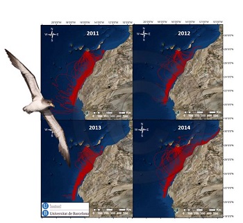 Viatges GPS de les baldrigues cendroses que crien a Veneguera (Gran Canària) durant la incubació corresponents a quatre anys: 2011, 2012, 2013 i 2014. Alimentar-se al Banc d’Arguin (un 600 km al sud de Gran Canària) pot suposar dues o tres setmanes de viatge mentre la parella incuba l’ou. Aquests viatges (recollits en el context de la tesi doctoral de José Manuel de los Reyes) ens mostren la predictibilitat de les ares de recerca d’aliment al llarg dels anys. Aquest aspecte es clau si el que volem es identificar i protegir aquestes àrees.