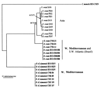 A la costa catalana O. ovata coexisteix amb O. siamensis, de morfologia molt semblant però que queden separades en l’anàlisi filogenètica. De fet, morfològicament, només es poden diferenciar en els casos extrems, en què O. siamensis és molt aplanada i l’altra més rodona. No obstant això, el que dominen són les formes intermèdies.