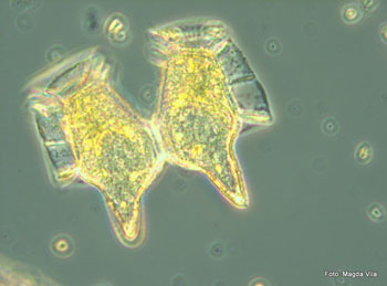 Algunes microalgues marines també poden produir toxines. La majoria d’aquestes microalgues tòxiques pertanyen al grup anomenat dinoflagel·lades, i unes poques al grup de les diatomees (veg. missatge de La increïble diversitat dels organismes planctònics).