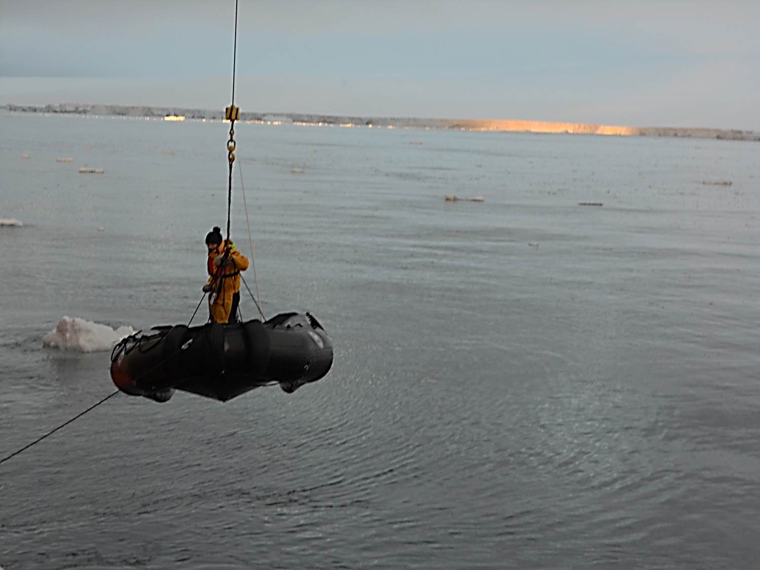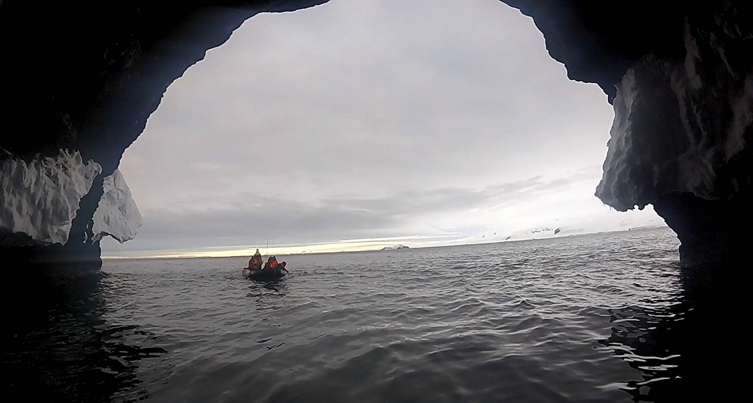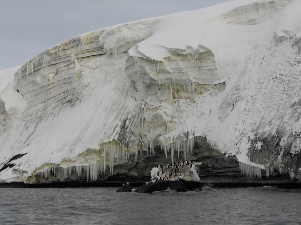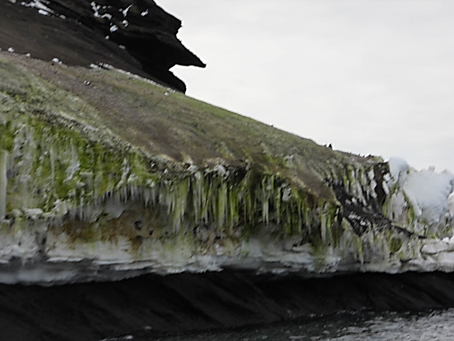 M’ha tocat baixar a fer un volt per l’illot de Lauff, un cràter emergit amb forma de dos terços de circumferència. Roca torrada i negra mig coberta de glaç. Agulles de gel de fusió que pengen per tot arreu, i regalims de gel verd, semblant al de l’illa de Scott. A recer del cràter, pingüins en tots els racons, la majoria d’Adèlia, algun Rei. En Baptiste afluixa el motor perquè puguem gaudir d’aquesta estona, per una vegada que sortim del vaixell. Després, fem la volta al cràter per fora i entrem en una cova amb glaç incrustat a la roca. A l’aigua verda distingim alguna bestiola gelatinosa.