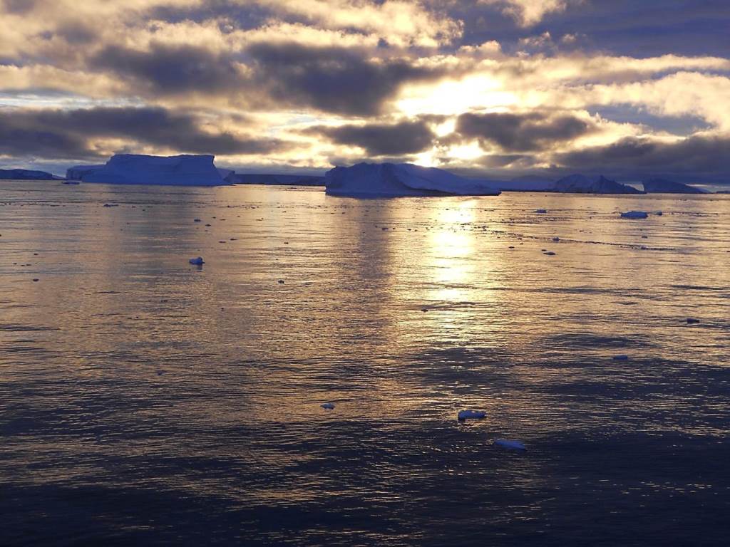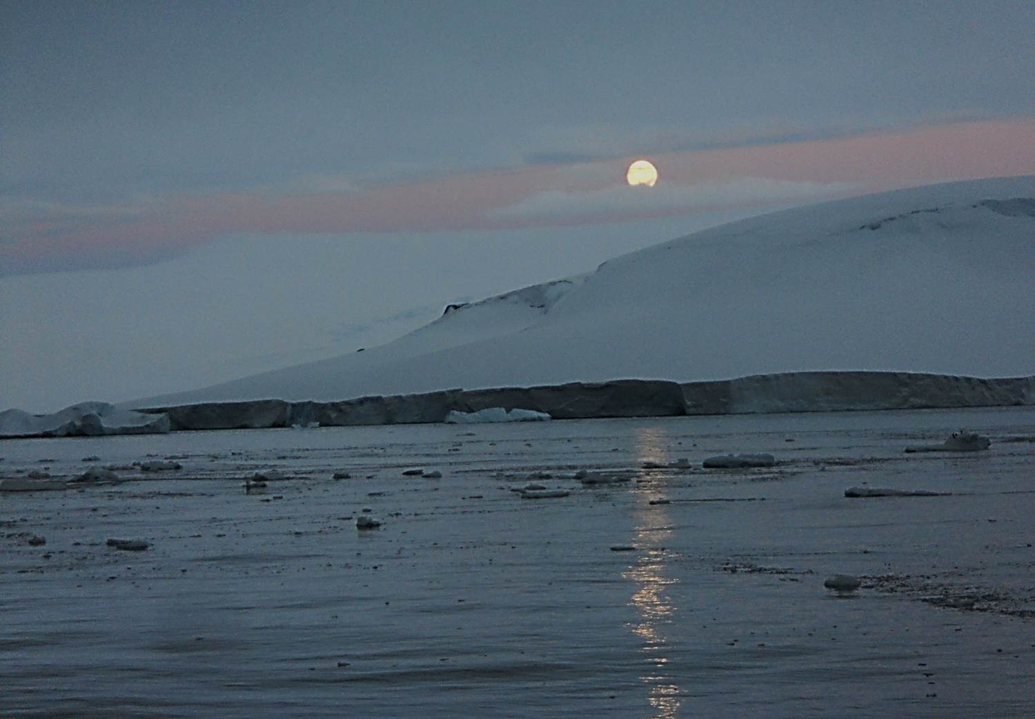 Ens envolten icebergs de totes les mides, i tots convenim que aquest és un paisatge genuïnament antàrtic. La posta de sol escampa daurats i s’allarga entre les 8 i les 11 del vespre, mentre la lluna senyoreja a l’altra banda i desperta aquesta sensació que, aquí baix, tot és ara, tot conflueix en un punt del temps. La nit passa i no baixa, no para taula, i la mitja llum fa córrer les converses.
