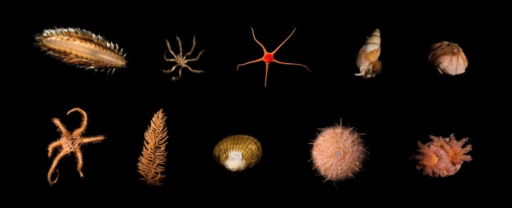 De dreta a esquerra i de dalt a baix: Aphrodite sp., Nymphon sp. (picnogònid), Ophyoperla koehleri, Neobuccinum sp., Chiton, Ophia canta, corall, Cyclocardia sp., Sterachnius antarctica (eriçó), i corall.