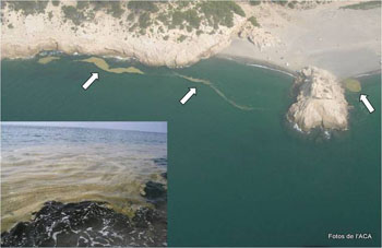 Fotografia aèria i costanera del mucílag (del ACA) a la platja del Torn. La fotografia sobreposada mostra l’aspecte de la proliferació.