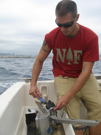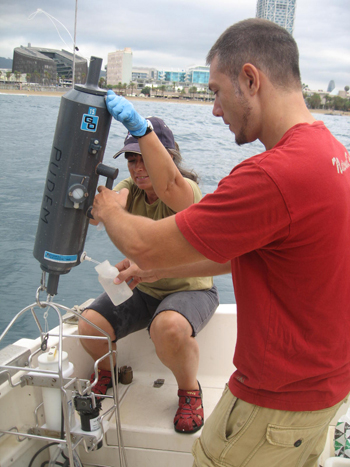 Mostratge davant la costa de Barcelona. Els investigadors fan servir un aparell que permet agafar mostres d’aigua a la fondària que hom desitja.