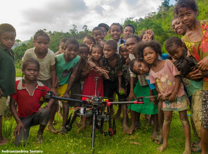 Imatge: nens locals encuriosits pel dron. Fotografia d’Andriamitandrina Santatra.