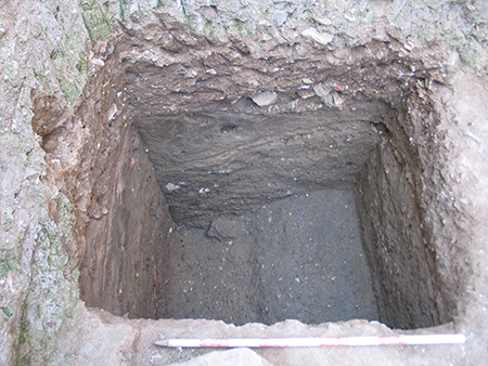 Com que la zona ocupada pel fossat és extensa el rebaix s’ha concentrat en una cala d’1 m2. En aquest cas el que ens interessa és obtenir tota la columna estratigràfica per poder recollir mostres de cada un dels estrats que amortitzen tant el fossat de finals del segle III com les restes dels nivells que rebleixen el fossat del segle I.