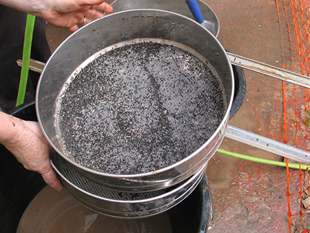 Tot el sediment remullat es passa a garbellar tant la part flotant com les restes sedimentàries. El fem passar per diversos sedassos de mides diferents per poder recollir totes les restes per més petites que siguin. Si aquests dies heu passat pel carrer de Sotstinent Navarro ens haureu vist, i no, no som buscadors d’or sinó de microfauna, pol•len, carbons…. amb això no ens farem rics però és molt apassionant!