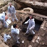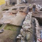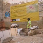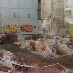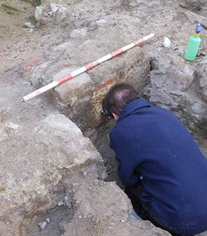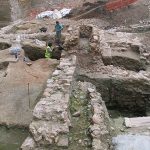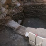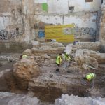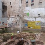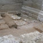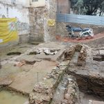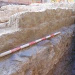 Hem descobert bona part d’un mur que pertany a una de les estances d’una possible domus. D’aquesta habitació no en sabem la utilitat encara, pel fet que ens trobem immersos en el procés d’excavació dels estrats que l’amortitzen. Un cop han començat a aparèixer les primeres pedres de la construcció d’aquest mur, hem pogut apreciar que a la cara interna del mateix, apareixia una fina capa d’estuc, (una capa uniforme de calç) el qual hem pogut posar al descobert en una petita part, per tal de poder entreveure la seva tipologia i estat de conservació. De vegades aquests estucs només fan la funció de capa protectora o impermeabilitzant, i d’altres serveixen de llenç per a decorar les parets de les habitacions.