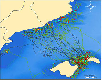 I és que la precisió d’aquests aparells és d’uns pocs metres i et permeten saber en cada moment on i quan ha estat l’animal que els porti. Per seguir les trajectòries dels ocells marins nosaltres els programem perquè registrin una posició cada 5 minuts. Aquesta informació no només pot servir per identificar àrees importants pels ocells al mar, sinó per estudiar les interaccions dels ocells marins amb els pesquers.