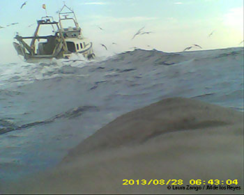A Espanya, gràcies a un sistema de seguiment de vaixells amb GPS podem saber on són els pesquers a cada moment. Creuant aquestes dues informacions podem esbrinar si, per exemple una baldriga, ha estat seguint un pesquer durant la seva trajectòria. Per si hi hagués algun dubte de que no només es creuen amb els vaixells sinó que els segueixen activament, hem posat algunes càmeres portables a l’esquena d’algunes baldrigues. Aquestes càmeres treuen una fotografia cada 5 minuts, i d’aquesta manera podem confirmar visualment quin tipus de vaixell estan seguint.