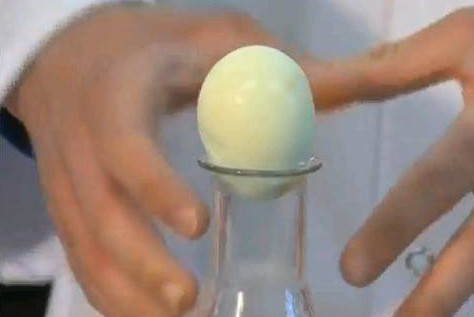 Primer cremem un paper dins el matràs.  L’aire de dins s’escapa perquè l’aire calent és menys dens i ascendeix, i es genera un buit parcial. Això vol dir que baixa la pressió dins del matràs i aleshores, com que la pressió atmosfèrica és mes forta, empeny l’ou vers l’interior.