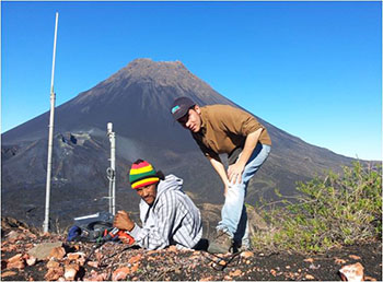 El Denis i l’Adrià inspeccionen un cau de Gongon amb un videoscopi, un aparell que ens permet veure que hi ha dins en cau a través d’una petita càmera. Darrera seu, entre els dos pals, es pot veure el nou conus volcànic format per la última erupció (Foto de Jacob González-Solís).