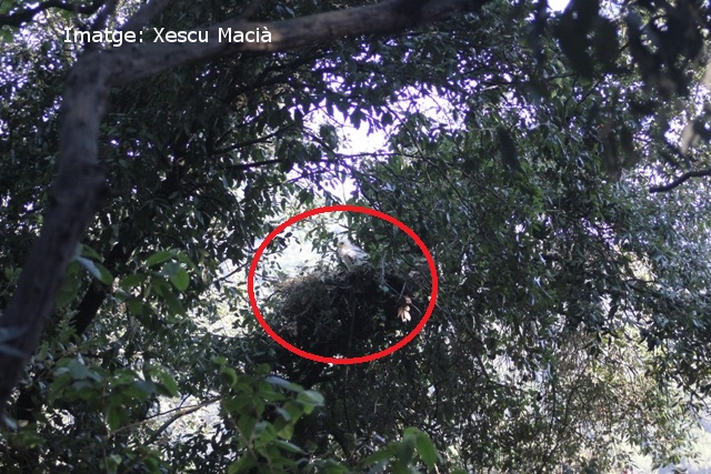 Imatge: un niu d’aligot vesper amb un poll visible. Els polls de curta edat tenen el plomatge de color blanc i els nius són més fàcils de detectar llavors per aquesta característica. Una vegada els polls són més grans, el color del plomatge és marró i la localització visual del niu és encara més difícil. Fotografia: F. X. Macià.