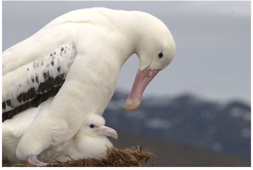 Un albatros viatger protegeix a la seva cria durant els primers dies de vida. Poc després el deixen sol dia i nit i els pares només el visiten per alimentar-lo breument durant els 9 mesos que durarà el seu creixement. El cicle de cria complet dura un any sencer i l’esforç parental es tant gran que els albatros viatgers només poden criar un cop cada dos anys. Aquesta espècie és l’ocell amb l’envergadura més gran del món, ja que amida uns 3 m de punta a punta de l’ala!