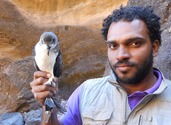 El Hurculano Dinis, tècnic de seguiment ecològic del Parc Natural de Fogo, sosté un petrell Gongon.