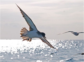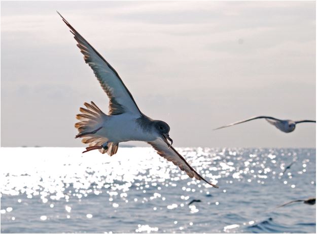Una de les baldrigues cendroses que hem marcat amb geolocalitzadors a l’illot de Pantaleu (Mallorca), fotografiada des d’un vaixell per Maties Rabassa. Fixeu-vos que a la pota hi porta un petit aparell (el geolocalitzador) adherit a l’anella.