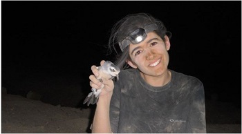 La Laura sosté un petrell carablanc que acaba de treure d’un cau de Ilheu de Cima. Els petrells carablancs fan els seus caus allargassats a terres molt sorrenques, i per a treure’ls del cau cal ficar-hi tot el braç i arrebossar-se de pols.