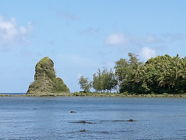 Avui descansem… ja tocava una mica. És clar que pera nosaltres descansar vol dir aixecar-se ben aviat per anar a conèixer una mica més les costums dels chamorros i la seva història. El Joe Quinata i el seu fill Xavier ens porten d’excursió a diverses badies a prop d’Umatac. Abans de començar , el Joe ens explica que anem a un lloc sagrat per a ells i que és important que respectem el que trobem i que no deixem res enrere. Esperàvem un viatge tranquil però no ha estat així del tot ja que la idea del passeig tranquil ha estat tota una petita aventura ja que el camí més adient és anar caminat per la platja. I aquest ha estat el problema! Les platges de Guam són ben boniques però moltes tenen platges de pedres i roques que rellisquen molt. A més a més s’ha de caminar amb els peus ben coberts ja que si no podem prendre mal ja que les roques són filoses i alguns animals marins amb punxes s’amaguen a la sorra i no els notes fins que els trepitges. La veritat és que ens costa força caminar mentre les ones bateguen ja que mantenir l’equilibre no és gens fàcil.