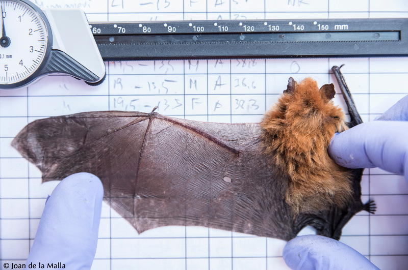 Imatge: Mesurant un ratpenat capturat amb una de les nostres xarxes. Fotografia de: Joan de la Malla.
