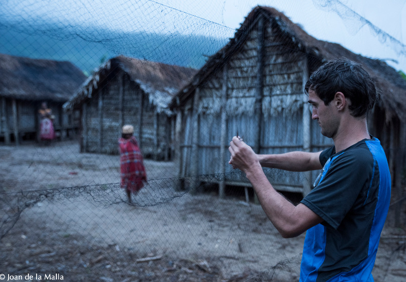A part dels ratpenats forestals, durant aquesta expedició també estem interessats en estudiar els ratpenats que es refugien en ambients humanitats, poblats i viles, o en coves. Per això, altres nits ens dirigim cap a poblats aïllats a l’interior de Madagascar on intentem capturar el màxim nombre d’espècies que es refugien a les cases de fusta o entre les fulles de les teulades. Tant en una situació com l’altra, la nit ens la passem revisant les xarxes cada 20 minuts, mesurant els animals capturats i identificant-los, habitualment rodejats de parells d’ulls que ens vigilen entre les copes dels arbres.