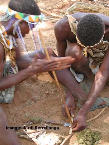 Dos caçadors Hadzabe fent foc per fricció amb pals (llac Eyasi, Tanzània)