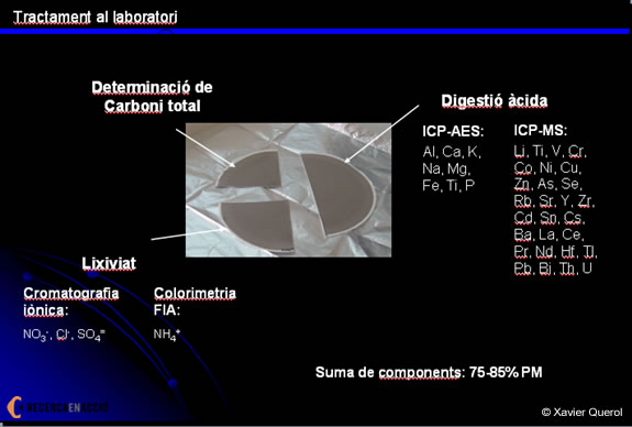 Per una altra part, també aplicarem una altra porció de la mostra (un quart), un tractament amb aigua destil·lada (lixiviació). Això ens permetrà extraure i analitzar (per IC) els compostos solubles en aigua (sulfats, nitrats, clorurs). L’última porció del filtre (un quart) la utilitzarem per a analitzar la concentració de carboni al filtre (LECO).