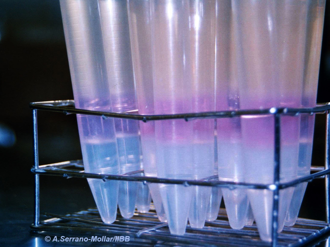 Per purificar els pneumòcits vam fer el que s’anomena una separació en gradient. En un tub posem diferents líquids de diferents densitats uns a sobre els altres. Com que tenen densitat diferent no es barregen i queden dipositats en vaires capes. Aleshores posem la nostra barreja de cèl·lules a sobre de tot i posem el tub a una centrífuga. Això fa baixar les cèl·lules, però no totes arriben fins a baix. Cada tipus cel·lular es quedarà a la capa que tingui la mateixa densitat que les cèl·lules. Això ens permetia recollir després la capa corresponent a la dels pneumòcits.
