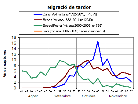 La freqüència de captures a diverses estacions ornitològiques és un indicador del pas migratori dels ocells, en aquest cas del tallarol de casquet. Font: SIOC, ICO.