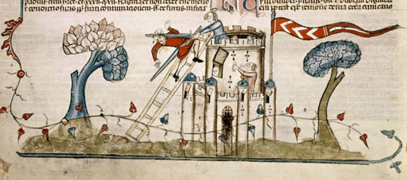 La Il·lustració mostra la defensa d’un castell assetjat (miniatura d’un manuscrit anglès de les Decretals de Gregori IX).