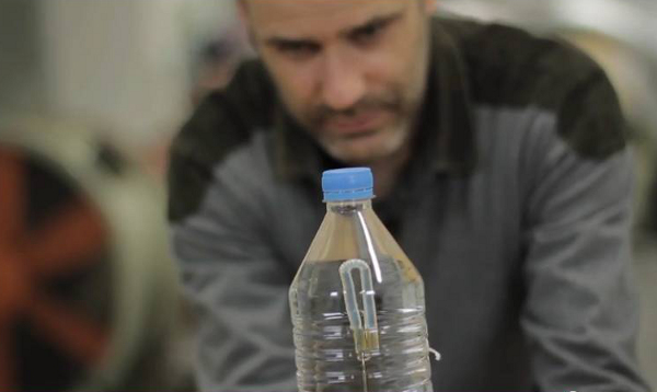 L’experiment que podeu veure en el vídeo demostra que l’aire, en tenir una densitat menor que l’aigua, sura i ascendeix quan se submergeix. L’experiment és una rèplica feta amb material senzill del clàssic experiment del diablet de Descartes.